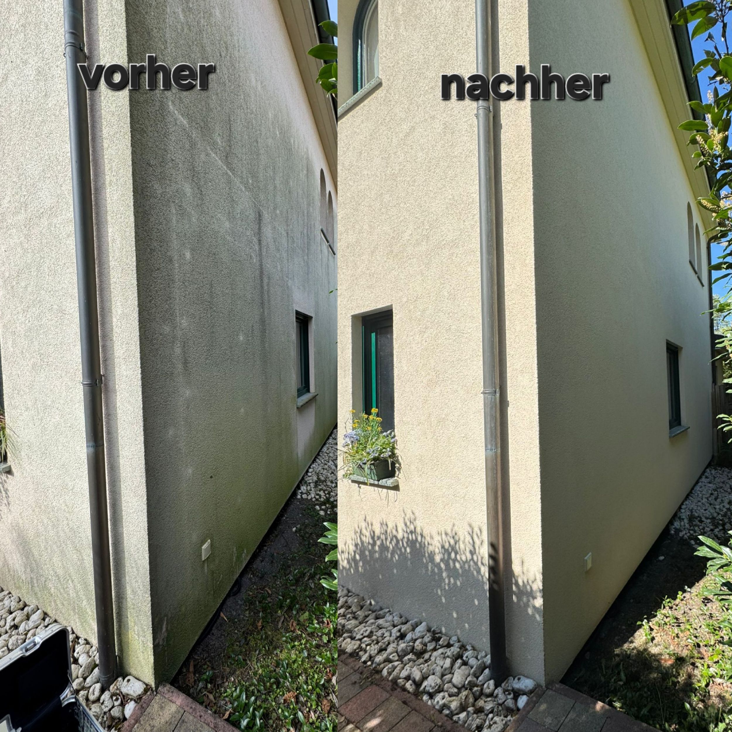 - Auftragen der Reinigungslösung: Die verschmutzten Flächen werden mit einem speziellen Fassadenreiniger behandelt. Die Wirkung zeigt sich schnell, ohne die Fassade zu schädigen.